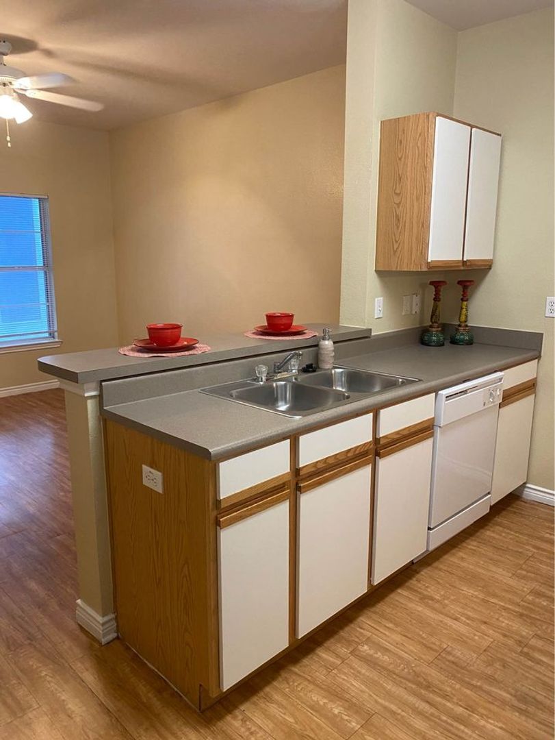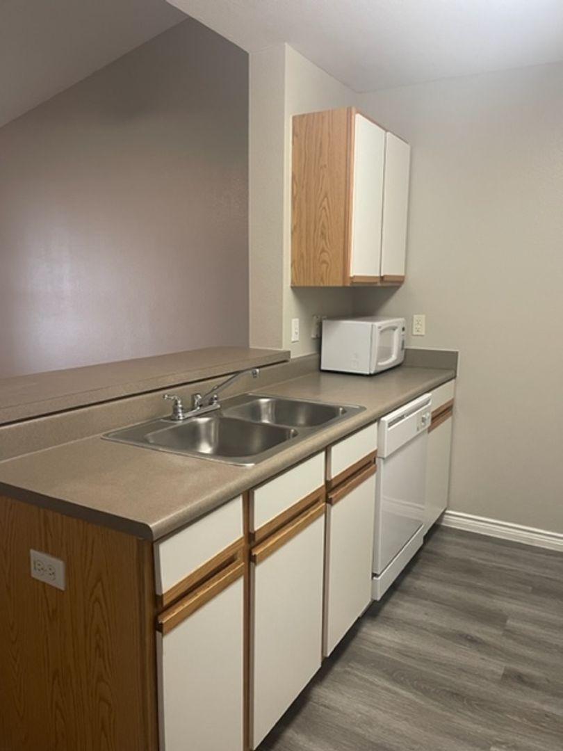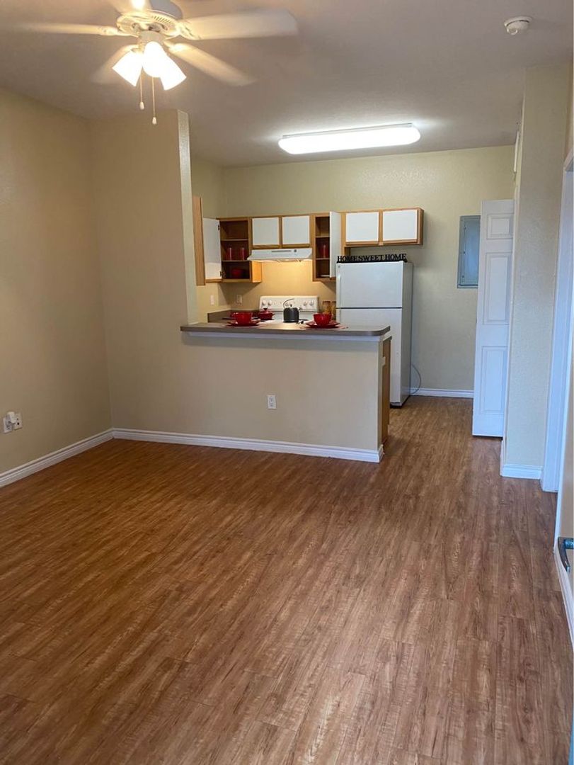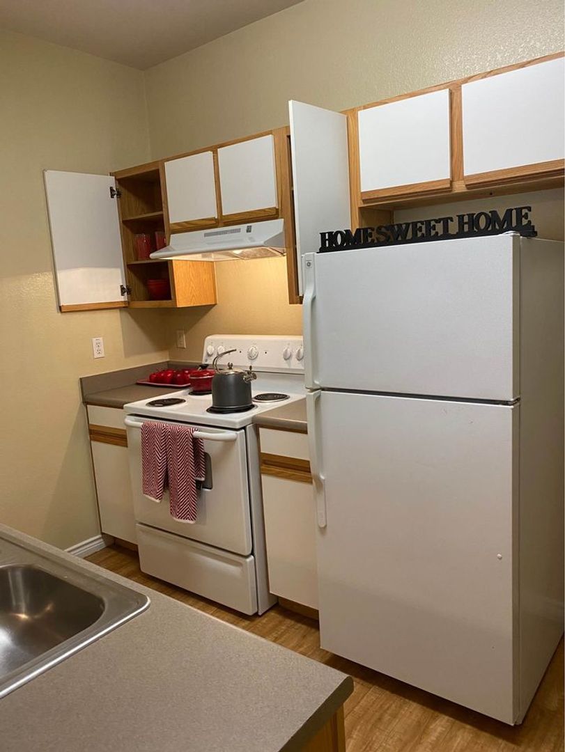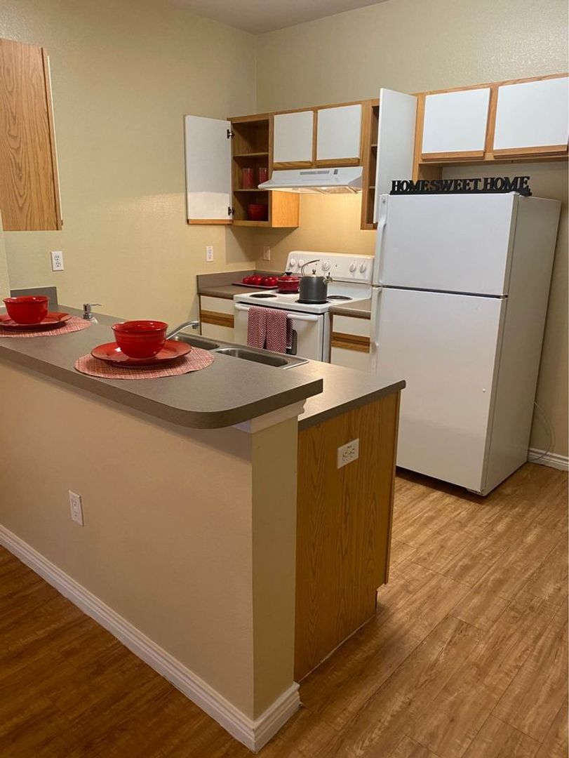 Our Bandera Floor Plan is a one bedroom, one bathroom, 543 square feet, cozy apartment. It features an open concept kitchen with full size washer and dryer connections. The bedroom is perfect size for any bed size, and has a spacious bathroom. Each unit may differ when it comes to wall and cabinet color, as well as upgraded features, which are all pictured in our ad. Please call our office to see what we have available!