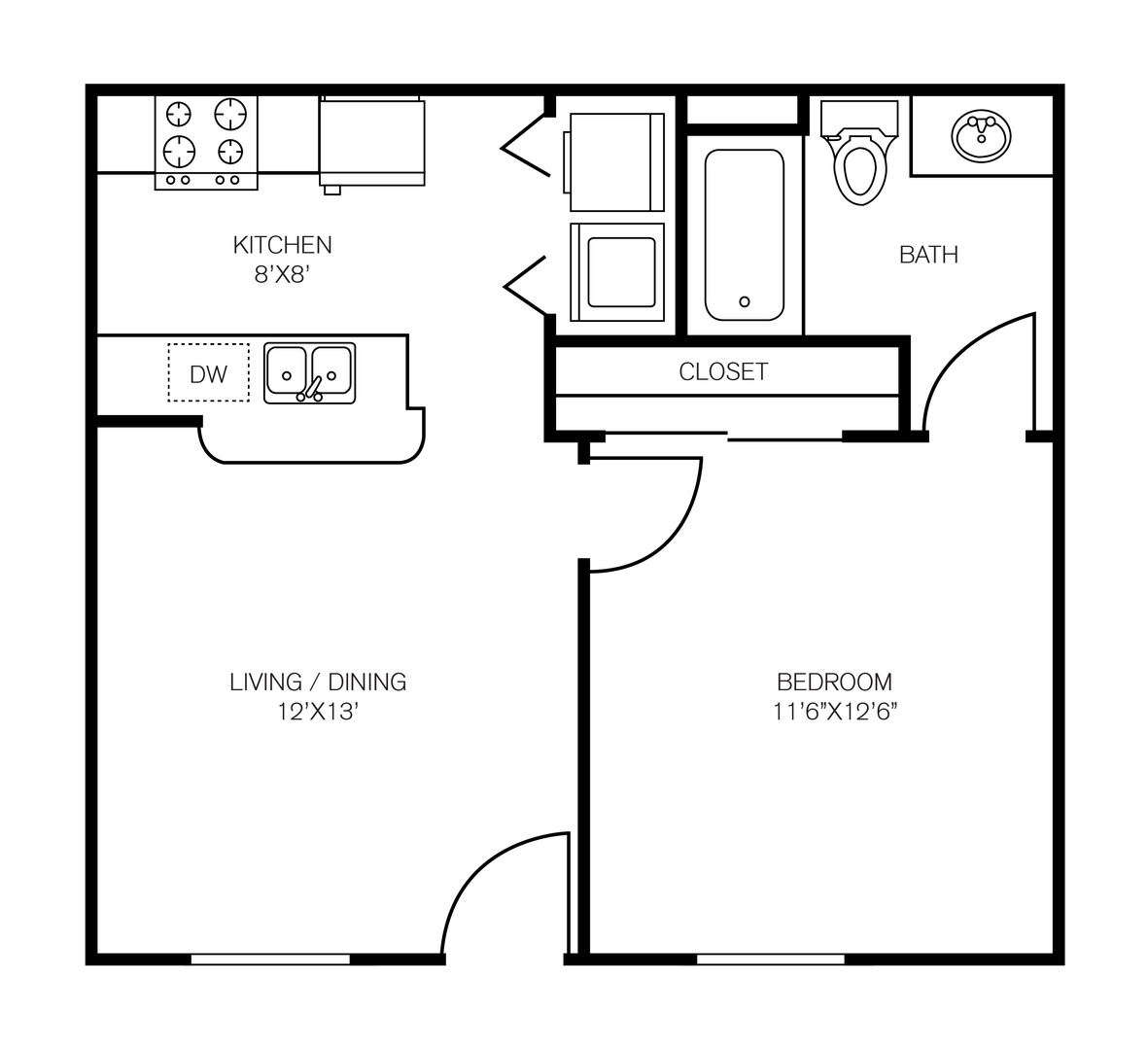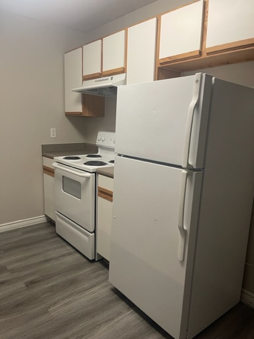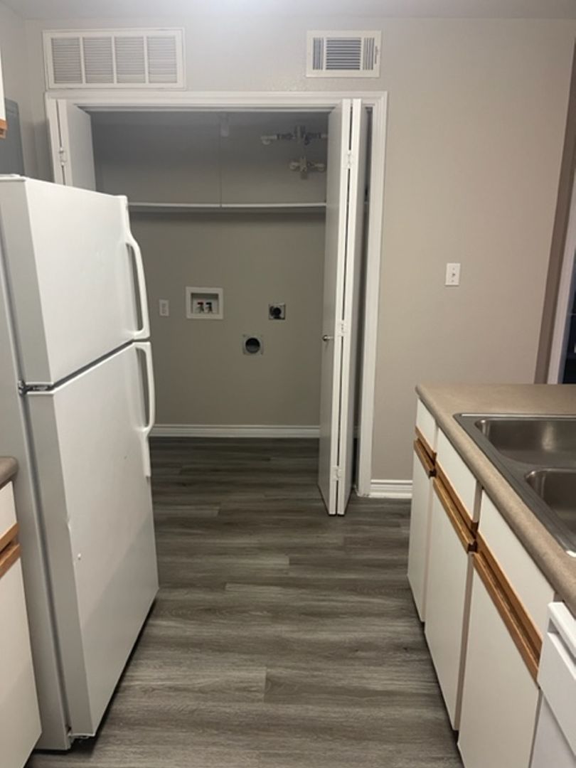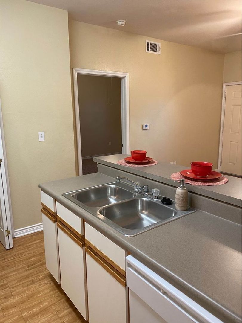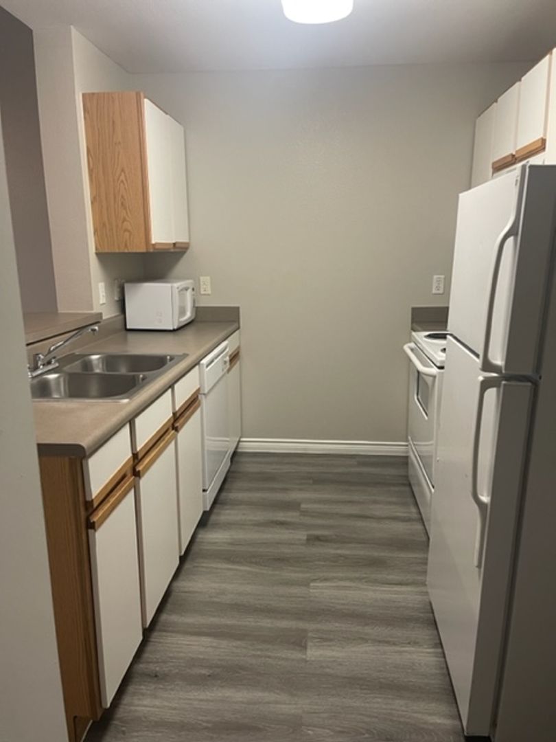 Our Bandera Floor Plan is a one bedroom, one bathroom, 543 square feet, cozy apartment. It features an open concept kitchen with full size washer and dryer connections. The bedroom is perfect size for any bed size, and has a spacious bathroom. Each unit may differ when it comes to wall and cabinet color, as well as upgraded features, which are all pictured in our ad. Please call our office to see what we have available!