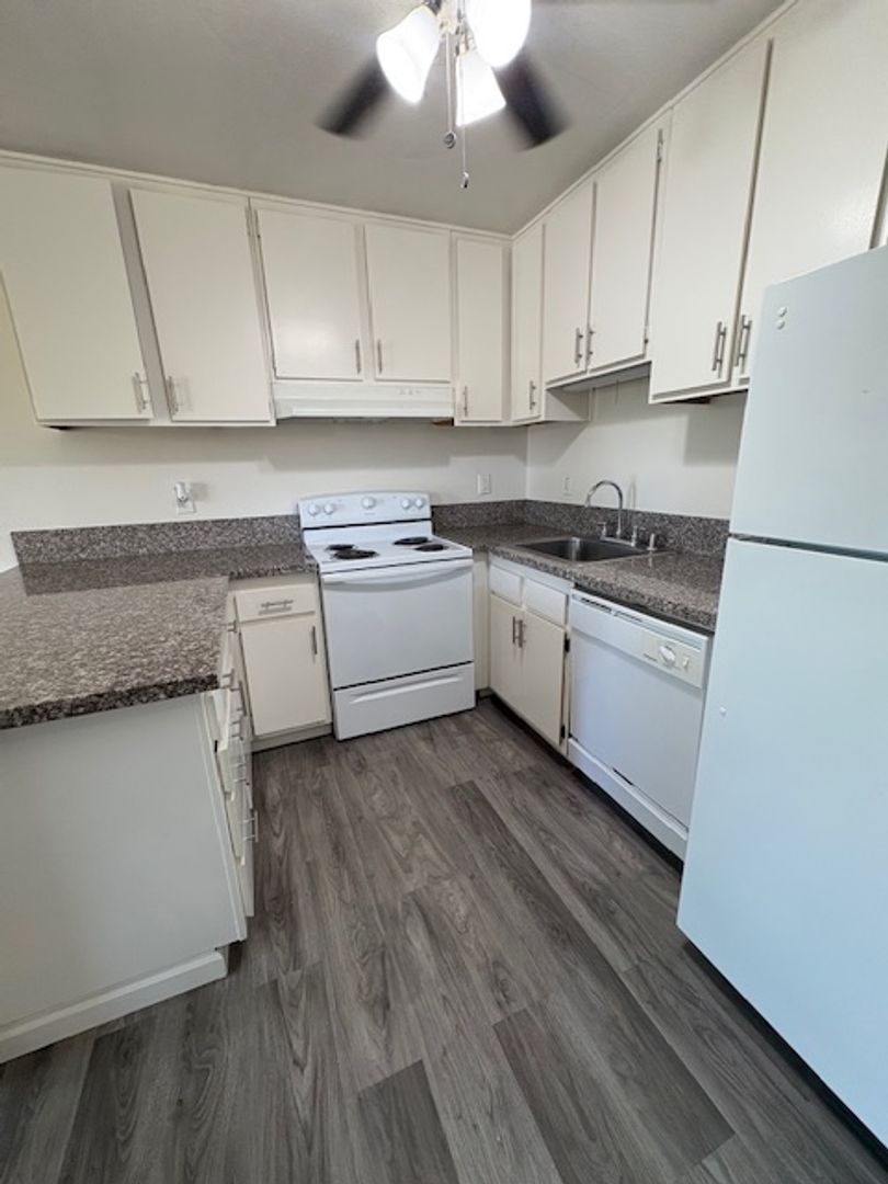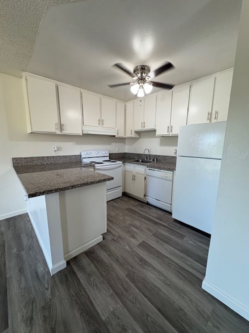 Each of the apartments feature large Kitchens with ample counter and cabinet space. Dishwasher, Stove/Oven and Refrigerator provided. Kitchens view into Dining and Living rooms. Good sized Bedrooms, some with walk in closets. Most apartments have two Linen closets in the hall and an Entry closet at the front door. All apartments have either a Balcony or large Patio.